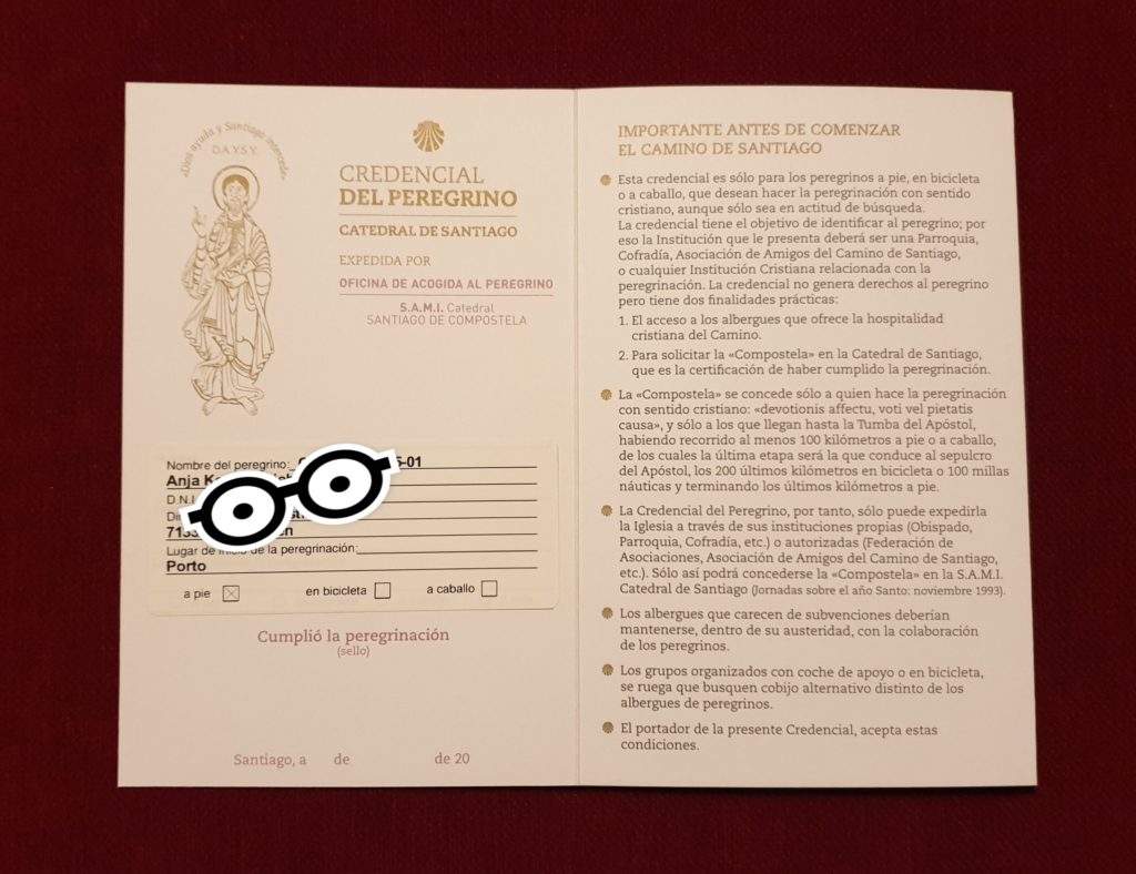 Neben meiner offiziellen Pilger-Nummer ist im „Credencial del Peregrino“ auch mein Name mit vollständiger Anschrift und die Nummer meines Personalausweises eingetragen.